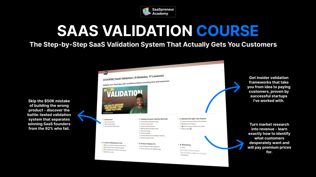 Don’t let your SaaS become another missed opportunity. Skip the risks of building without validation and instead create something customers actually want. This course shows you how to get there, with tools, templates, and step-by-step guidance.